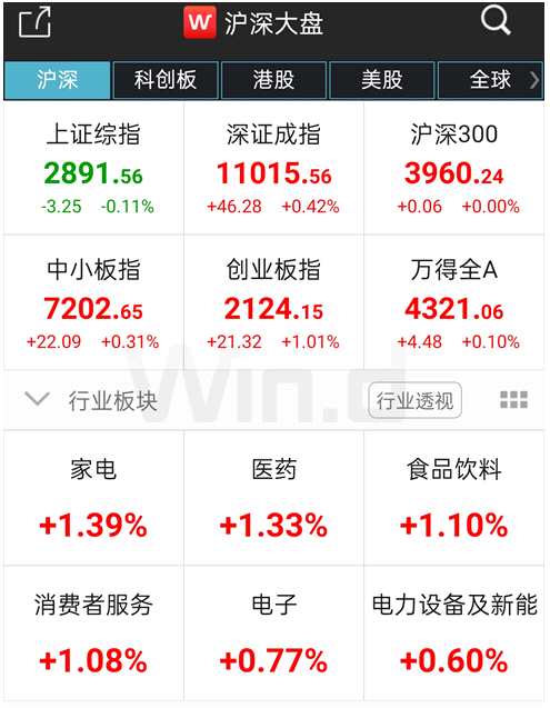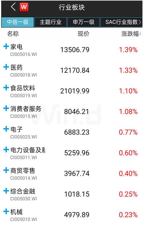 行業(yè)方面,家電、醫(yī)藥、食品飲料等消費(fèi)股領(lǐng)漲。