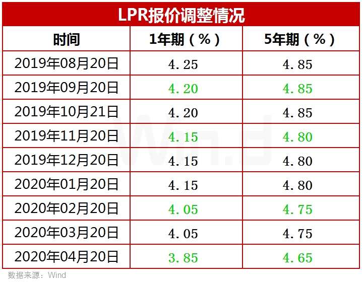 4月20日,LPR報(bào)價(jià)公布,1年期品種報(bào)3.85%,上次為4.05%,下降20BP并創(chuàng)去年8月份啟動(dòng)以來單次最大降幅;5年期以上品種報(bào)4.65%,上次為4.75%。