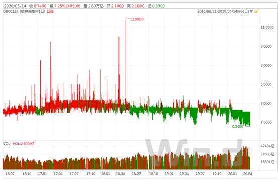 從歷史走勢看,2019年年中、年末以及2020年年初,這一利率曾一度跌至1%以下。4月3日,央行宣布將實(shí)施定向降準(zhǔn)后,DR001再度跌至1%下方。4月7日,DR001一度跌至0.6%,成為該指標(biāo)自2014年12月15日公布以來的歷史最低值。隨后,這一利率有所回升,5月13日,DR001盤中最低報(bào)0.54%創(chuàng)歷史新低。