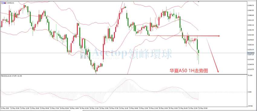 從華夏A50指數(shù)日線走勢(shì)圖來(lái)看,布林帶三軌輕微向上開口,MACD零軸上方動(dòng)能柱開始縮短,出現(xiàn)頂背離,行情目前處于高位區(qū)間震蕩階段。從上圖一小時(shí)走勢(shì)圖來(lái)看,布林帶三軌向下開口,MACD零軸下方動(dòng)能柱在逐漸增長(zhǎng),未出現(xiàn)底背離,行情走勢(shì)震蕩偏空。日內(nèi)操作上建議先逢高做空。關(guān)注小時(shí)圖前高壓力位13320附近的阻力作用,反彈至此位置遇阻后,可以逢高布局空單。
