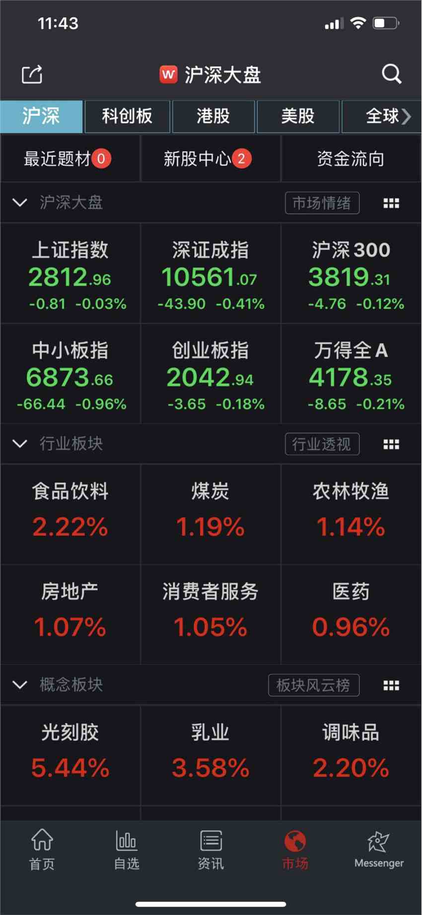 今日,兩市繼續(xù)調(diào)整,截至午間收盤,上證指數(shù)下跌0.03%,報(bào)2812.96點(diǎn);深證成指下跌0.41%,報(bào)10561.07點(diǎn);創(chuàng)業(yè)板指下跌0.18%,報(bào)2042.94點(diǎn)。連續(xù)調(diào)整之下,上證指數(shù)逼近2800點(diǎn),早盤最低報(bào)2802.47點(diǎn)。盤面上市場(chǎng)呈現(xiàn)結(jié)構(gòu)性行情,大消費(fèi)板塊表現(xiàn)搶眼。