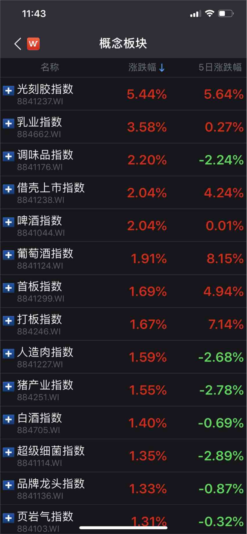 概念板塊中,光刻膠、乳業(yè)、調(diào)味品板塊漲幅居前,光線、網(wǎng)絡(luò)可視化、WIFI等板塊跌幅居前。