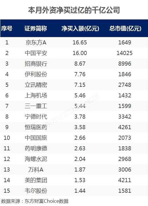 從北向資金來看,本月上榜十大活躍成交股的公司中,陸股通凈買入過億的有21只,其中15只是市值千億以上的大白馬,京東方A、中國平安是僅有的2只凈買入超10億元的個股,招商銀行、伊利股份、立訊精密、上海機場等大批大白馬獲得超億元的凈買入。