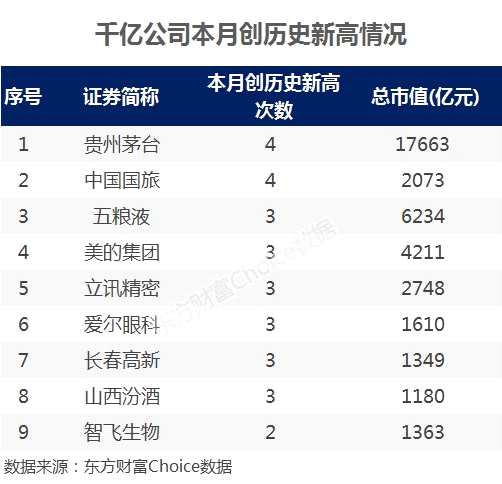 數(shù)據(jù)顯示,本周一,共有53只(不含年內(nèi)上市公司)個股創(chuàng)出歷史新高,其中9家公司是市值千億以上的大白馬,包括“白酒雙雄”貴州茅臺、五糧液。也包括美的集團、立訊精密、中國國旅、長春高新等等。