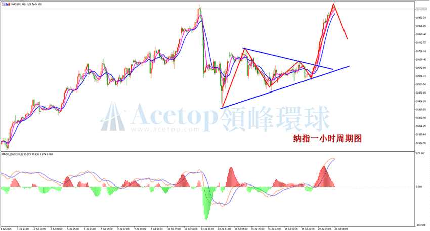 納斯達克指數(shù)一小時周期,在上周經(jīng)歷震蕩調(diào)整后,最終從低位開始大幅拉升,多頭上漲非常強烈,日內(nèi)早間繼續(xù)上行,即將再次創(chuàng)出歷史新高。從指標上看,MACD快慢線高位即將死叉,紅色動能柱已經(jīng)連續(xù)縮短,上漲動能已經(jīng)出現(xiàn)衰竭,日內(nèi)將會有回調(diào)產(chǎn)生。日內(nèi)交易上,建議選擇高位做空的思路進行操作。