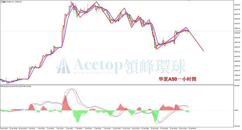 華夏A50一小時周期圖,昨日從低位開始大幅的反彈,大經(jīng)歷反彈后,下行趨勢依然未能改變,日內(nèi)早間短暫沖高后開始出現(xiàn)回落。從指標上看,一小時MACD快慢線DIFF和DEA已經(jīng)出現(xiàn)死叉,綠色動能柱開始出現(xiàn),新的空頭動能又開始出現(xiàn)。日內(nèi)交易上,由于下跌趨勢還在時行中,建議逢高布局空單的思路進行操作。
