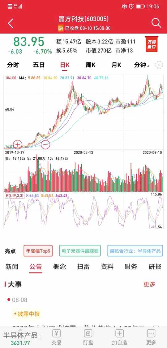 1)估值太高:如【晶方科技(603005)、股吧】8月7日晚間披露半年報,上半年公司實現(xiàn)營收4.55億元,同比增長126.96%;凈利潤1.56億元,同比增長623.97%。8月10日公司股價低開低走,跌幅達6.70%。事實上,今年以來,公司股價大幅走高,若將周期拉長,自去年9月份以來,公司股價漲幅超過500%,不到一年時間超5倍的漲幅,且當前市盈率已超過百倍,股價或已透支業(yè)績增速。