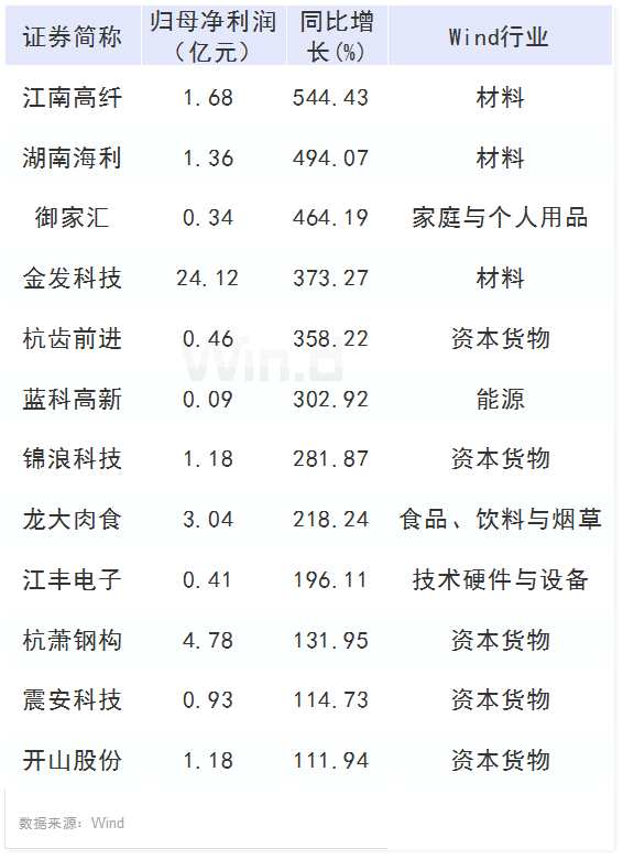 而8月10日晚間披露的55家整體業(yè)績更好。Wind數(shù)據(jù)顯示,其中業(yè)績虧損的僅有4家,其余51家實現(xiàn)盈利。同比增長方面,36家上半年業(yè)績實現(xiàn)增長,占比達65.5%。尤其是江南高纖、【湖南海利(600731)、股吧】等12家增長超過100%,其主要來自資本貨物、材料等行業(yè)。