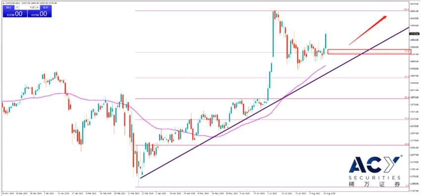 在牛市基本面不變情況下,最近2個月調(diào)整,多次觸及15000點附近后反彈,在15000有一個明顯強力的支撐。昨日CHINA50有一個明顯的拉升,同時從上證指數(shù)上看,也突破的上證指數(shù)關鍵位重新站上3400點關口。后續(xù)上漲動能非常強。