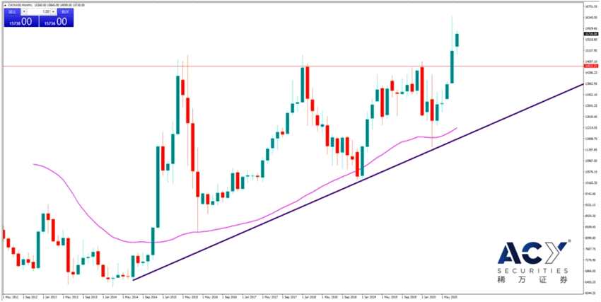 從下面的月線圖可以看到,2014年開始A50進入上漲的趨勢,其中來回三次跌落趨勢線后反彈。同時,在 2015年到2019年有多次嘗試突破上方阻力位15000,均未能成功。2020年7月份終于突破了維持了多年的阻力,持續(xù)上漲。