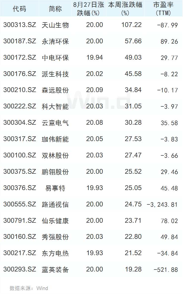 在創(chuàng)業(yè)板次新股快速分化的同時(shí),創(chuàng)業(yè)板老股則演繹別樣風(fēng)采。自8月24日漲跌幅擴(kuò)大至20%以來,創(chuàng)業(yè)板每日漲停個(gè)股連續(xù)增長(zhǎng),8月27日,有16家公司漲停,多數(shù)公司屬于連續(xù)上漲,其中天山生物甚至4個(gè)漲停,本周股價(jià)漲幅已經(jīng)翻番。此外,永清環(huán)保、中電環(huán)保、派生科技、森遠(yuǎn)股份、科大智能、云意電氣等公司本周漲幅均超過30%。從漲幅較大公司的估值來看,部分公司市盈率偏高甚至是業(yè)績(jī)虧損。