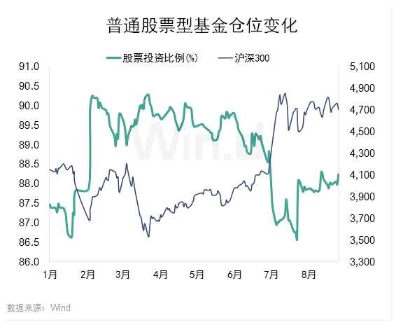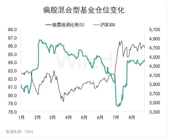 從細(xì)分類型看,股票型基金中,普通股票型基金倉位為88.25%,較8月初上升0.34個(gè)百分點(diǎn);混合型基金中,偏股混合型基金倉位為84.33%,較8月初上升0.16個(gè)百分點(diǎn),較7月初上升1.86個(gè)百分點(diǎn)。