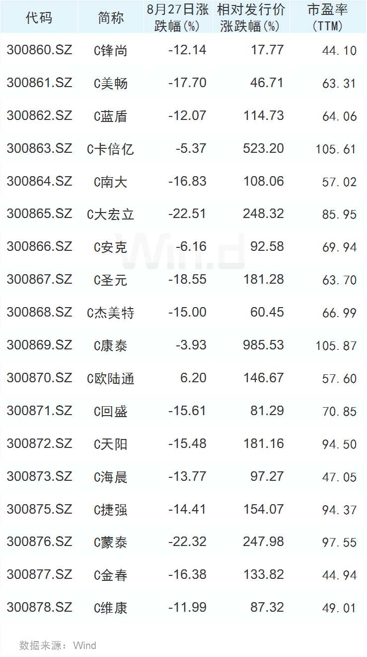 8月27日,18家24日上市的創(chuàng)業(yè)板次新股集體回調(diào),除1家公司股價(jià)上漲外,其余公司全部下跌,14家公司跌幅超過10%,其中2家公司跌幅超過20%。
