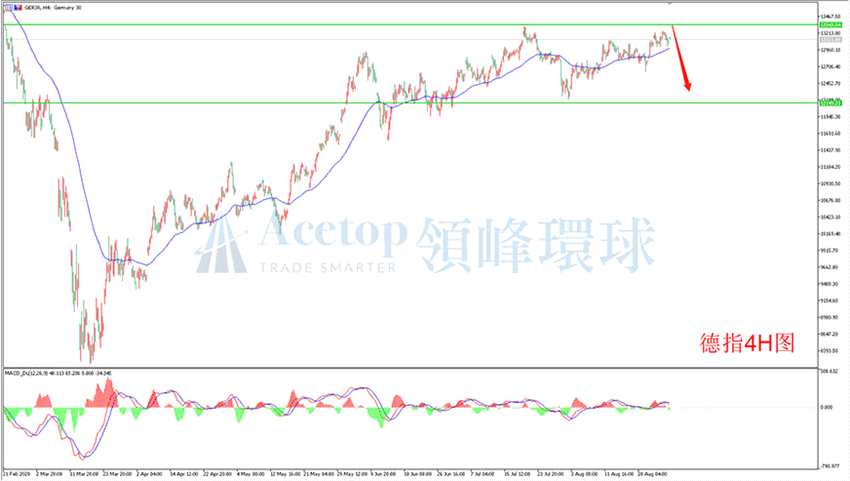 德指昨日繼續(xù)上行,最高到達13200附近,走勢較強。近期德指的走勢一直在高位調(diào)整,從4小時圖上看,德指價格維持在高位區(qū)間震蕩,目前到達區(qū)間上沿,壓力位在13350附近。上方的壓力在13350附近,下方的支撐位在11600附近,MACD指標(biāo)上,雙線在零軸附近,能量柱在縮量,顯示價格的調(diào)整信號。故在策略上,建議在德指壓力位做空。