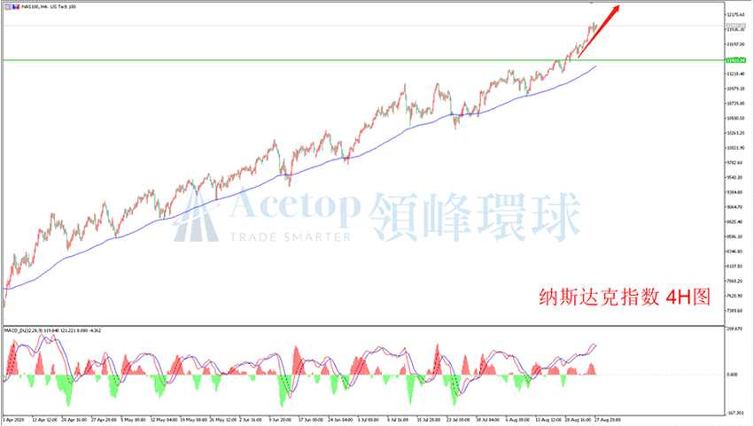 納斯達克指數(shù)昨日繼續(xù)沖高,受鮑威爾講話影響,小幅回落,回落后繼續(xù)創(chuàng)新高。在4小時圖上,下方的120EMA均線有著較好的支撐和趨勢效果,目前價格偏離均線,顯示出加速的效果,繼續(xù)看趨勢的延續(xù)。指標(biāo)上,下方的MACD指標(biāo)雙線在零軸上方形成金叉,能量柱逐漸放量,顯示出強勢的信號。因此目前來看,納斯達克指數(shù)的走勢為高位調(diào)整,具體策略上,則可以在調(diào)整后的支撐位附近輕倉嘗試多單。