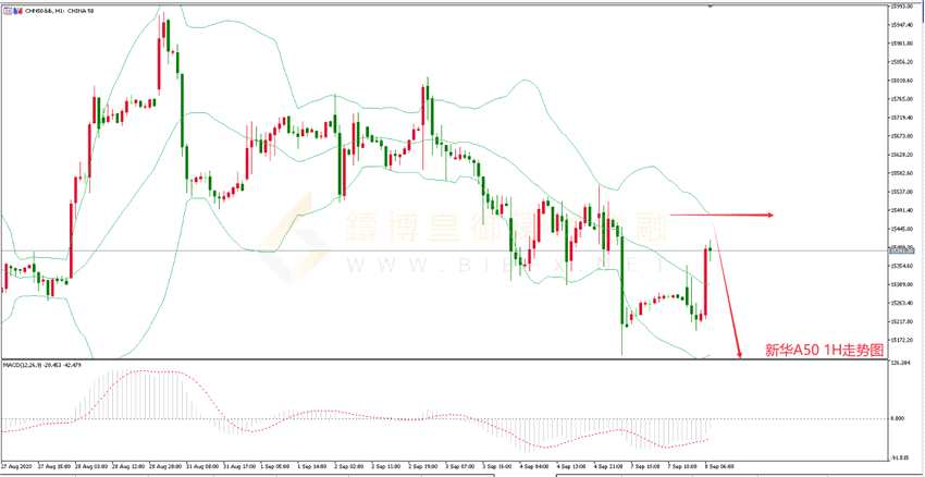 從新華A50日線走勢(shì)圖來(lái)看,布林帶三軌幾乎走平,MACD零軸上方動(dòng)能柱有所縮短,行情目前處于高位區(qū)間震蕩階段。從下圖一小時(shí)走勢(shì)圖來(lái)看,布林帶三軌向下開口,MACD零軸下方動(dòng)能柱在逐漸縮短,出現(xiàn)底背離,短線有反彈的概率。日內(nèi)操作上建議關(guān)注一小時(shí)圖布林帶上軌15480附近的阻力作用,反彈至此位置遇阻后可以逢高布局空單。