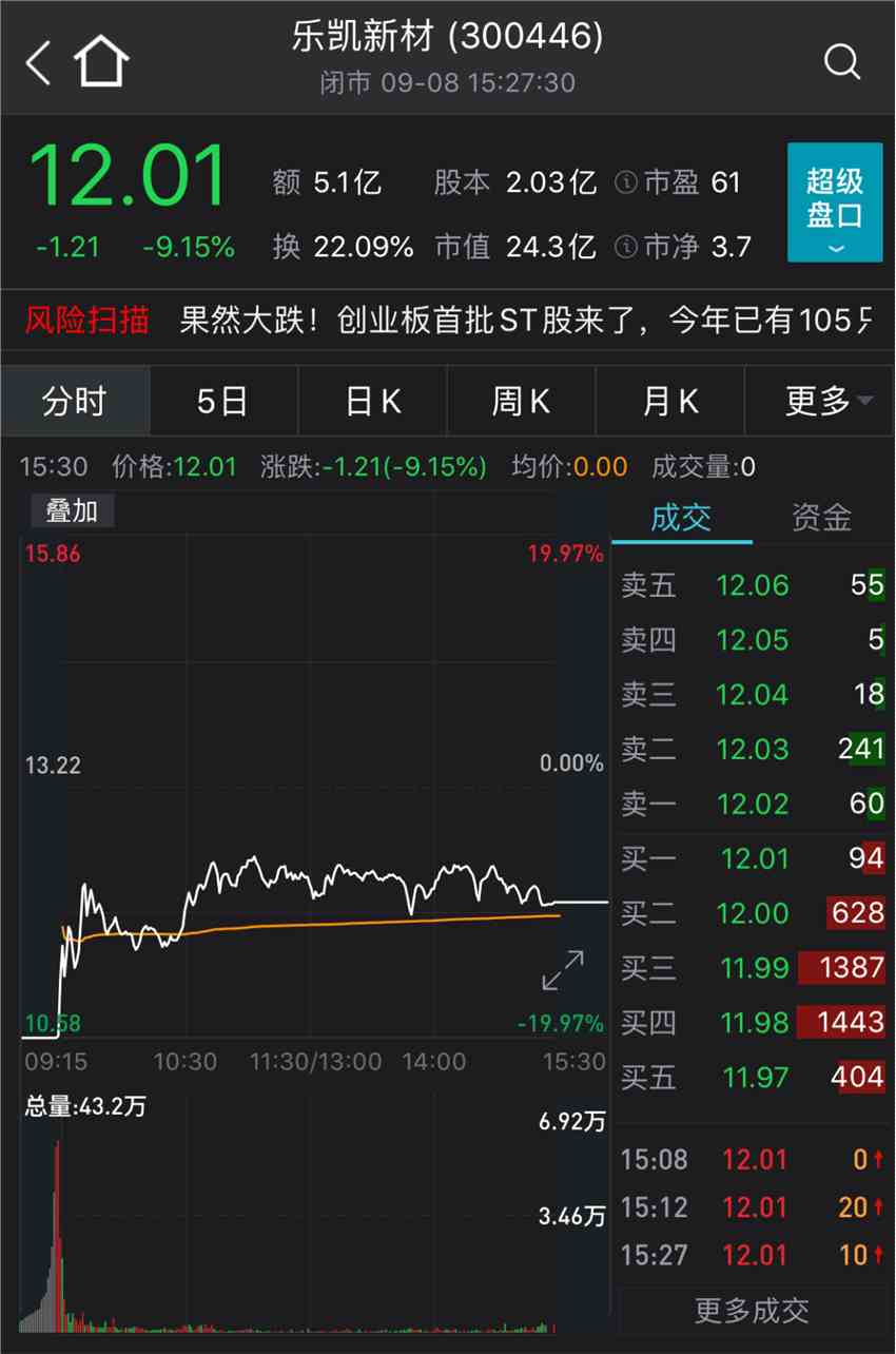 值得注意的是,很多創(chuàng)業(yè)板低價(jià)股基本面欠佳,“踩雷”風(fēng)險(xiǎn)已經(jīng)開(kāi)始顯現(xiàn)。9月7日晚間,樂(lè)凱新材和天龍光電雙雙披露,公司股票將自9月12日新規(guī)實(shí)施后被ST,成為創(chuàng)業(yè)板首批ST股。9月8日,兩只股票應(yīng)聲大跌9.15%和4.10%。