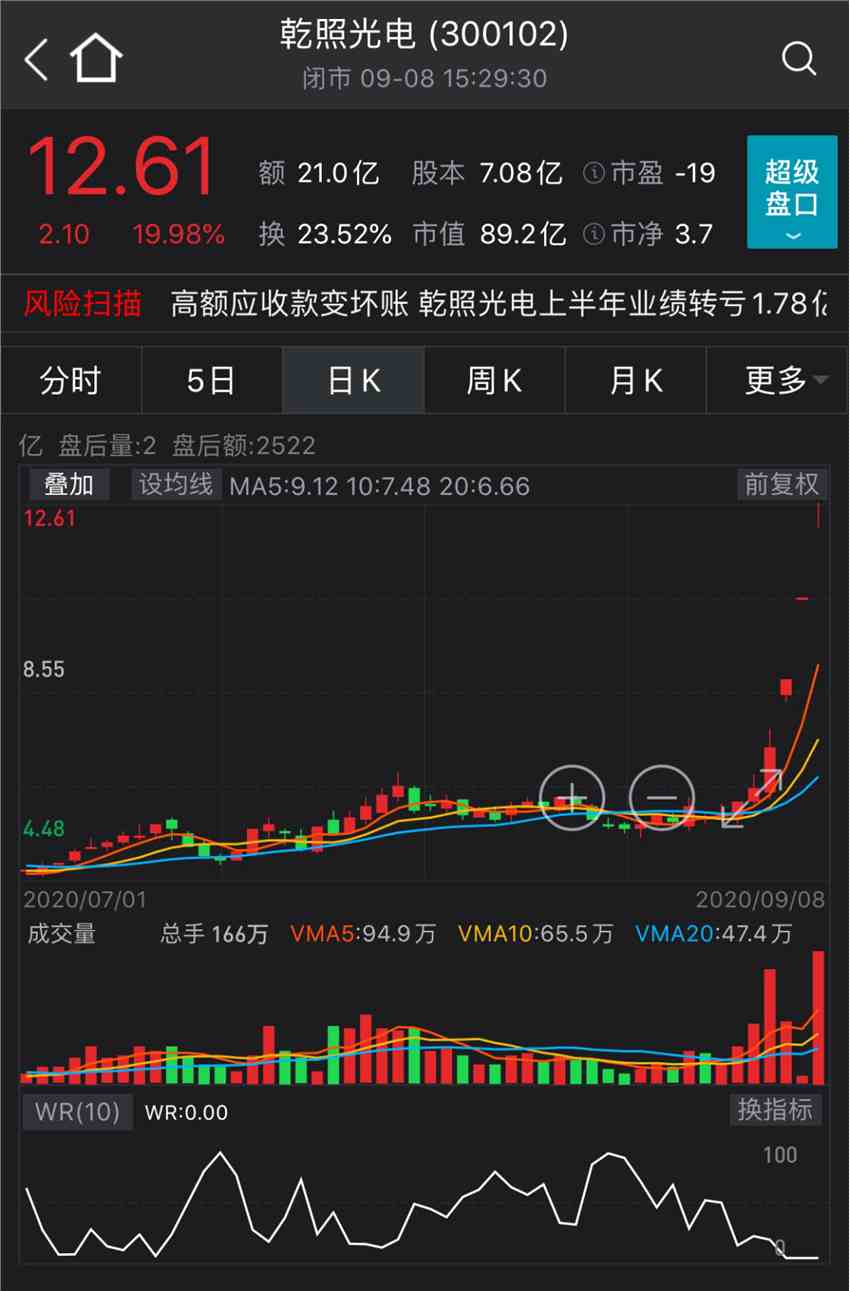 無(wú)獨(dú)有偶。9月8日,干照光電“一”字漲停,收獲三連板。最近6個(gè)交易日,干照光電股價(jià)大漲118.17%,股價(jià)從不足6元/股攀升至12.61元/股,成為另一只被熱炒的創(chuàng)業(yè)板低價(jià)股。