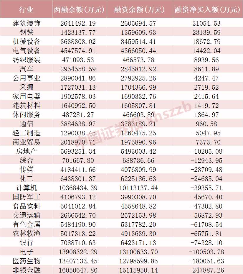 從行業(yè)板塊情況來看,Wind數(shù)據(jù)顯示,截至9月9日,本周前3個(gè)交易日,申萬一級28個(gè)行業(yè)中,有12個(gè)行業(yè)融資余額增加,融資余額凈買入金額前三的行業(yè)分別為建筑裝飾、鋼鐵、機(jī)械設(shè)備行業(yè),凈買入金額分別為3.11億元、2.31億元、1.87億元;融資余額凈賣出居前的三個(gè)行業(yè)分別為非銀金融、醫(yī)藥生物、電子行業(yè),凈賣出金額分別為24.79億元、18.01億元、10.05億元。