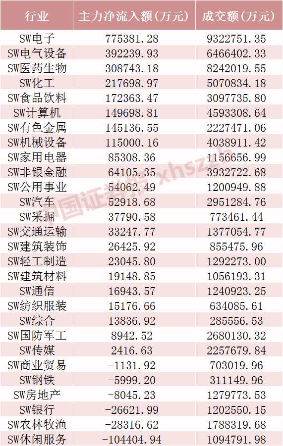Wind數(shù)據(jù)顯示,9日中小板主力資金凈流入88.14億元,創(chuàng)業(yè)板主力資金凈流入50.36億元,滬深300主力資金凈流入126.81億元。從行業(yè)板塊情況來看,9日主力資金僅在休閑服務(wù)、農(nóng)林牧漁、銀行、房地產(chǎn)、鋼鐵、商業(yè)貿(mào)易行業(yè)出現(xiàn)凈流出,凈流出金額分別為10.44億元、2.83億元、2.66億元、0.80億元、0.60億元、0.11億元;其他22個主力資金凈流入的行業(yè)中,電子、電氣設(shè)備、醫(yī)藥生物行業(yè)主力資金凈流入金額居前,分別凈流入77.54億元、39.22億元、30.87億元。