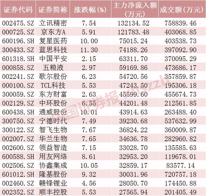 從個股情況來看,立訊精密、京東方A主力資金凈流入金額超過10億元,分別凈流入13.21億元、12.18億元。此外復(fù)星醫(yī)藥、藍思科技、中國平安、五糧液、歌爾股份等5只個股主力資金凈流入超5億元。