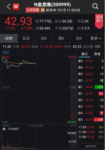 個股方面,有著“油中茅臺”之稱的金龍魚今日登陸創(chuàng)業(yè)板,高開90.51%。截至午間收盤,報42.93元/股,大漲67%,總市值為2327億元,已經(jīng)超過洋河股份和三一重工,位居A股第46位。在創(chuàng)業(yè)板內(nèi),其市值也僅次于寧德時代、邁瑞醫(yī)療、智飛生物和愛爾眼科,位居第5位。