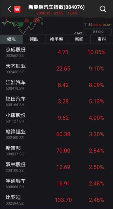新能源汽車概念繼續(xù)上漲。截至午盤,京威股份漲停,天齊鋰業(yè)、江淮汽車、福田汽車、小康股份、【雙林股份(300100)、股吧】等紛紛走高。