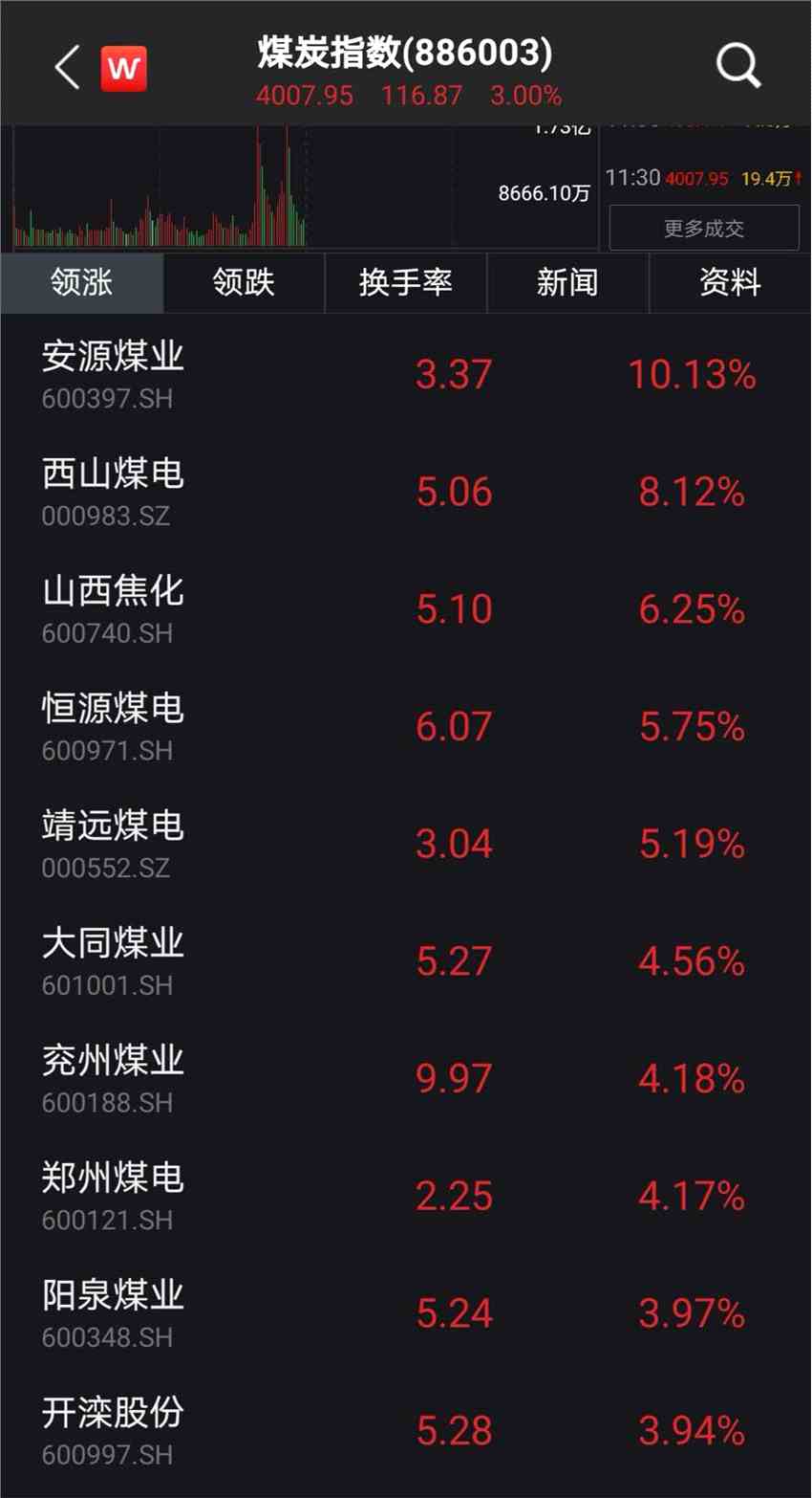 煤炭開采概念中,安源煤業(yè)午盤漲停,西山煤電、山西焦化、恒源煤電、靖遠(yuǎn)煤電等漲幅超5%。