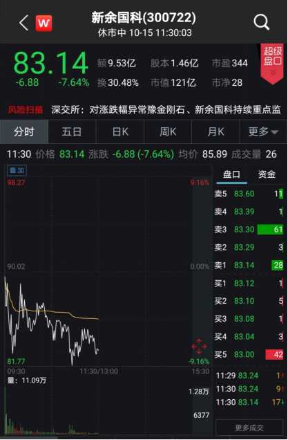 此前上漲的熱門股紛紛大跌。以新余國科為例,該公司在前一交易日漲停,但在14日上午盤中一度跌近7%。截至午盤,該股報83.14元/股,成交額9.53億元,換手率30.48%。
