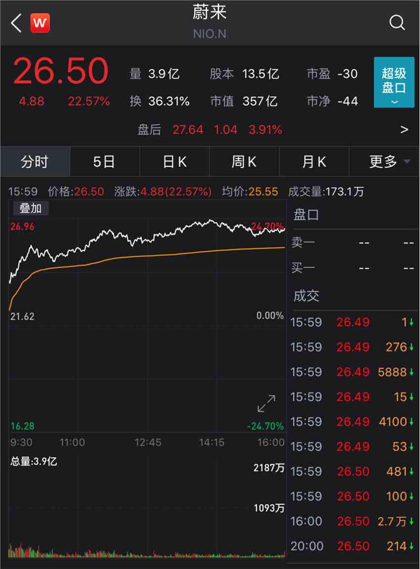 10月14日,在美上市的電動汽車制造商蔚來汽車股價飆升22.57%,收報26.50美元,創(chuàng)下新高,公司市值達(dá)357.46億美元。