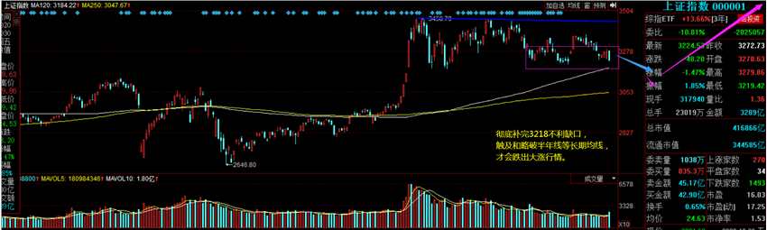 上圖是滬指日線,均線只畫(huà)了半年線和年線,上方藍(lán)線仍是昨日畫(huà)的3451頸線。今日滬指最低探3219,可惜差一點(diǎn),9月3218戰(zhàn)法不利缺口未補(bǔ)完;今日滬指半年線3184,今日最低3219也未觸及和略破半年線。這說(shuō)明,目前滬深技術(shù)調(diào)整雖處于中后期,但不充分。