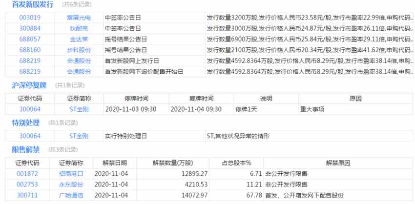 今日申購、停復牌、特別處理、限售解禁等提醒: