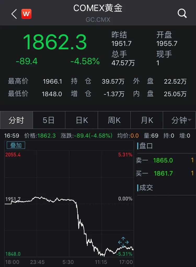 COMEX黃金期貨收跌4.58%報(bào)1862.3美元/盎司,創(chuàng)8月11日以來最大單日跌幅;COMEX白銀期貨收跌5.91%報(bào)24.145美元/盎司。