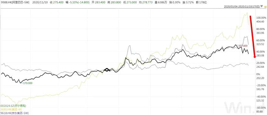 在11月10日當天,阿里巴巴、京東、美團點評等巨頭在港股股價悉數(shù)下跌。其中,阿里巴巴港股跌5.1%,京東集團港股跌8.78%,美團跌10.5%。 其中,美團市值一天就跌去了2071億港元。
