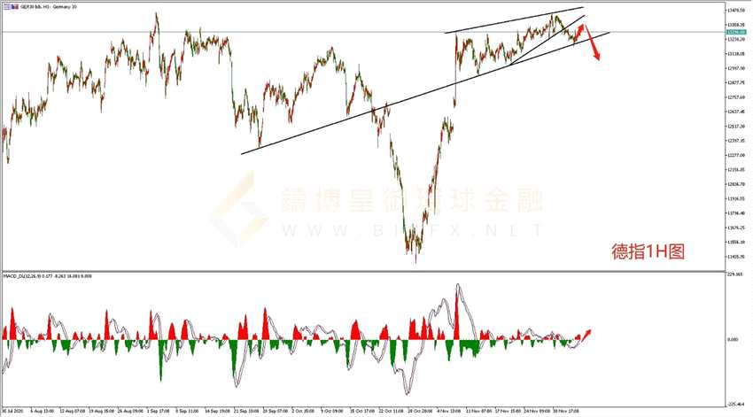 從下圖德指1小時(shí)圖形上可以看出,指數(shù)上周五出現(xiàn)小幅反彈,主要是價(jià)格受到下方技術(shù)支撐,目前價(jià)格處于弱勢(shì)反彈中,大方向從形態(tài)上看,價(jià)格依舊處于三角震蕩區(qū)間內(nèi)部;指標(biāo)MACD顯示,雙線處于零軸偏下方整體偏弱,但雙線有金叉往上的跡象,表示價(jià)格有進(jìn)一步反彈的需求,目前來(lái)看指數(shù)整體進(jìn)入往下的調(diào)整節(jié)奏,指數(shù)延續(xù)往下調(diào)整的概率加大。建議日內(nèi)投資者采取輕倉(cāng)試空思路進(jìn)行操作,關(guān)注上方高位13340一線附近壓力。