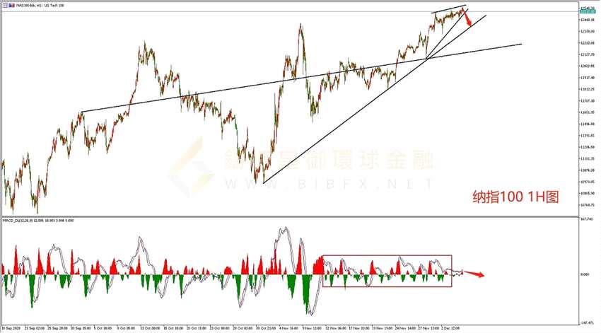 從下圖納指1小時(shí)周期圖形上可以看出,指數(shù)上周五處于高位弱勢(shì)震蕩上行,價(jià)格并未發(fā)生太大波動(dòng),價(jià)格目前維持高位弱勢(shì)盤整,上漲動(dòng)能明顯有所減弱;從指標(biāo)MACD上看,雙線處于零軸附近橫盤運(yùn)行,但雙線交織互繞表明指標(biāo)動(dòng)能較弱。建議日內(nèi)投資者采取輕倉(cāng)試空思路進(jìn)行操作,空單入場(chǎng)參考震蕩小三角上軌12560附近,該區(qū)間附近有較強(qiáng)的阻力效果。