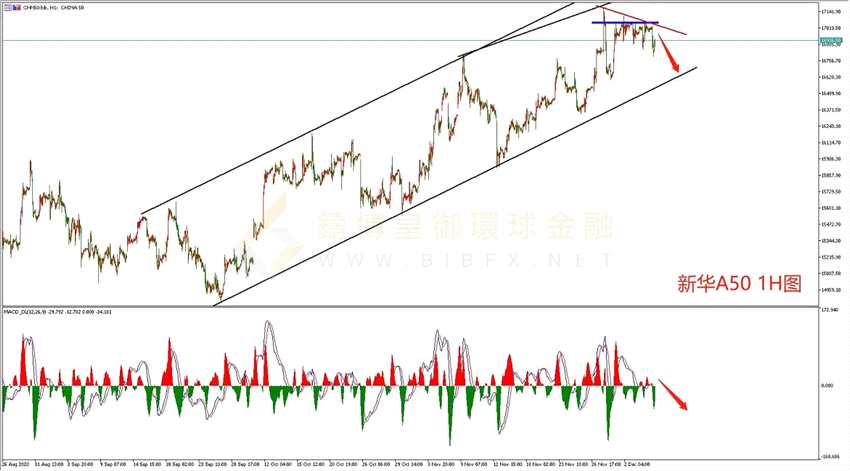 從下圖新華A50指數(shù)1小時(shí)圖形可以看出,指數(shù)上周五價(jià)格先下后上,價(jià)格依舊承壓上方壓力區(qū)附近,從形態(tài)上看依舊處于上漲通道內(nèi)部,目前價(jià)格處于高位有回調(diào)走弱跡象;指標(biāo)MACD雙線運(yùn)行到零軸附近,目前處于死叉空頭往下,預(yù)示后市有較高的概率延續(xù)弱勢(shì)回調(diào)。建議日內(nèi)投資者采取輕倉(cāng)試空思路進(jìn)行操作,空單入場(chǎng)參考通道上軌附近16970一線壓力,該區(qū)間附近有較強(qiáng)的阻力效果。