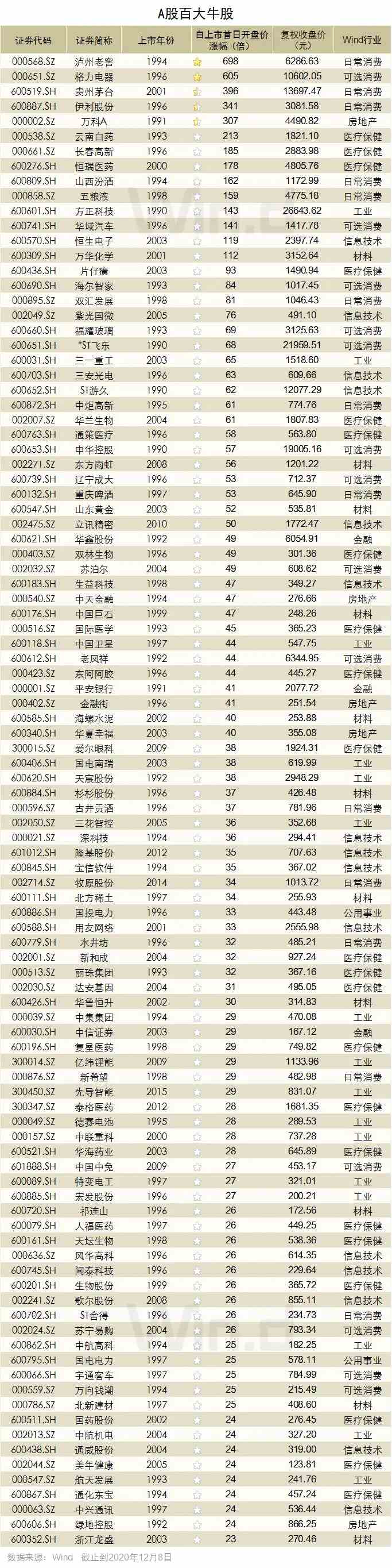 Wind數(shù)據(jù)統(tǒng)計顯示,截至12月8日,在A股上市時間超過5年的股票中,最新復(fù)權(quán)價較上市首日開盤價漲幅超過10倍的股票多達236只,其中漲幅超過100倍的超級大牛股就有14只,而這些股票大部分蘊藏于消費和醫(yī)藥行業(yè)中。