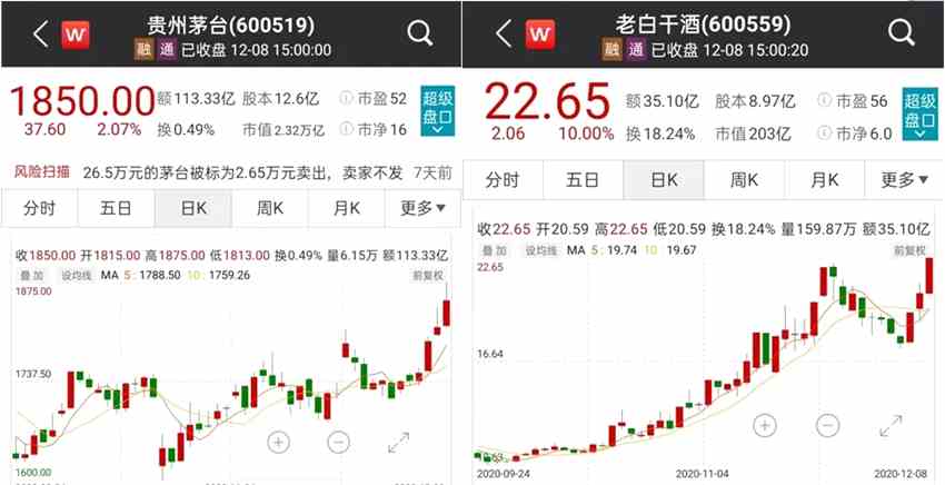 白酒股最近持續(xù)爆發(fā),周二(12月8日)全線上漲,貴州茅臺、老白干酒股價攜手創(chuàng)出歷史新高。