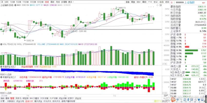 上證指數(shù)今天小幅低開后往上走,然后開始走單邊下跌,沒有抵抗,非常弱勢(shì)的走勢(shì),殺跌殺了一整天,全體不斷創(chuàng)出低點(diǎn)。
