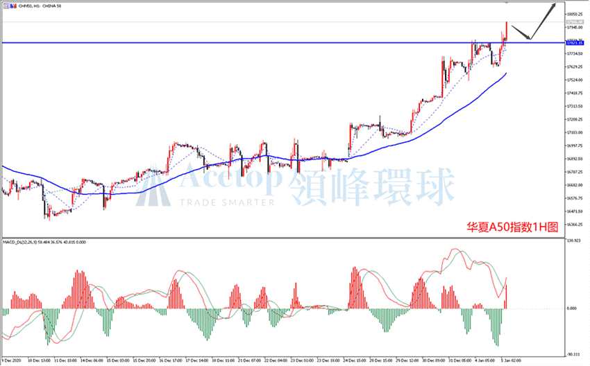 華夏A50指數(shù)今日開盤后快速上漲,突破前期高點(diǎn),再創(chuàng)新高,延續(xù)上升趨勢(shì),目前仍然在加速上行中。如上圖為1小時(shí)周期走勢(shì)圖,MA30均線不斷上行,K線始終在均線上方,昨天盡管出現(xiàn)了macd指標(biāo)的頂背離,但稍作回落后繼續(xù)上攻,表明趨勢(shì)極強(qiáng)。技術(shù)上,當(dāng)前最大為周線級(jí)別上升趨勢(shì),在無(wú)周期反轉(zhuǎn)信號(hào)信號(hào)以前,不能輕言見頂,建議繼續(xù)嘗試做多。