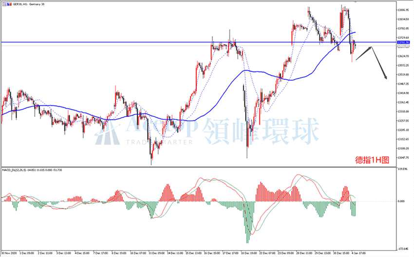 德指開盤繼續(xù)上行,最高到達(dá)13915附近,隨后盤中快速下跌,高位有雙重頂跡象。如上圖為1小時(shí)周期,德指昨天創(chuàng)新高后,MACD指標(biāo)并未同步創(chuàng)出新高,有頂背離信號(hào)并快速跌穿圖中前期成交密集區(qū)的支撐位,隨后反彈無(wú)法站穩(wěn)支撐,確認(rèn)支撐轉(zhuǎn)為壓力,建議日內(nèi)以做空為主,上方的壓力在13700的整數(shù)關(guān)口附近,建議依托此壓力位嘗試做空。
