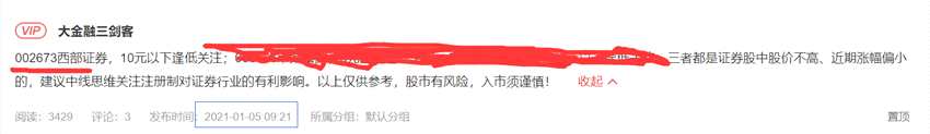 比如近期我在可來(lái)app,1月5日(前日,本周二)開(kāi)盤前逢低舉例002673西部證券,就是認(rèn)為大金融應(yīng)該是超級(jí)大主力的核心資產(chǎn)之一,也會(huì)享受注冊(cè)制好處,尤其股價(jià)低、前期漲幅不大、業(yè)績(jī)也尚可,當(dāng)時(shí)立足中線思維選股、底部進(jìn)場(chǎng),今天突然短線就漲停是意外之喜。下面有舉例時(shí)的截圖,大家好好體會(huì)選股思路。
