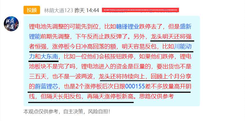 以上兩段是昨天文章原文。明確分析了鋰電池還將持續(xù),并且提示前期龍頭調(diào)整后將再度向上,尤其是技巧你抗跌且周二盤中醞釀上攻的個(gè)股,還明確了主升浪龍頭和龍頭股反包是最強(qiáng)方向。來(lái),看看,300014億緯鋰能漲幅14%再創(chuàng)新高,近期抗跌,昨天盤中醞釀上攻,002756永興材料也是近期抗跌昨天醞釀上攻,包括002497【雅化集團(tuán)(002497)、股吧】近期抗跌昨天盤中醞釀上攻,今日都是長(zhǎng)陽(yáng)或漲停,開(kāi)啟新一波。另外,龍頭股的反包果然強(qiáng)悍,000155川能動(dòng)力和002263大東南都漲停反包,關(guān)于龍頭反包的思路,看看昨天盤中的觀點(diǎn),看下圖