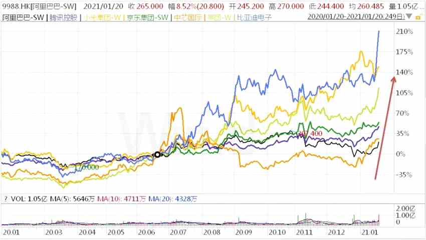 此外,阿里系在1月20日集體大漲,阿里健康大漲超17%高鑫零售漲超4%,阿里影業(yè)上漲超3%。