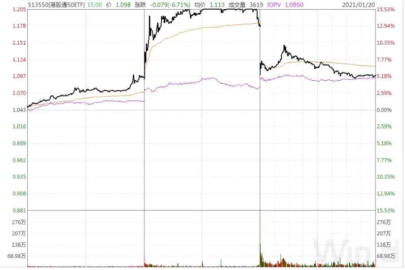 以華泰柏瑞中證港股通50ETF(以下簡稱“港股通50ETF”)為例,1月19日盤中,港股通50ETF凈值一度偏離達(dá)10%以上,全天資金凈流入34.66億元;1月20日,雖然有所回落,但仍處于溢價中,全天資金凈流入32.62億元。