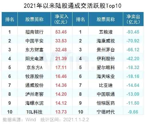 從滬股通、深股通前十大活躍股情況看,2021年以來滬深兩市每日活躍股中,共有26只個股出現(xiàn)北上資金凈買入,21只個股被凈賣出。其中招行凈流入額超過50億元,位居首位。五糧液遭凈賣出93.45億元。