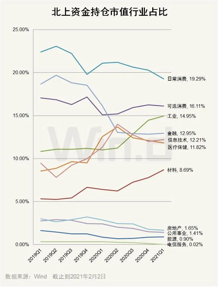 工業(yè)、材料行業(yè)占比逐步上行。其中工業(yè)持倉市值占比由2019年一季度的10.83%上升至14.95%,上升4.12個百分點;材料行業(yè)由5.33%上升至8.69%,升幅為3.36個百分點。