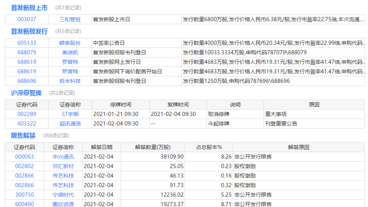 今日上市、申購、停復(fù)牌、限售解禁等提醒: