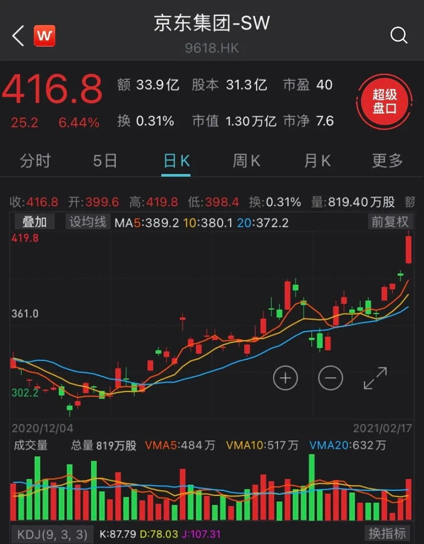受美股科技巨頭下跌的影響,周三港股中大型科技股阿里巴巴、騰訊、美團(tuán)均呈現(xiàn)低開高走行情,午后相繼拉升,分別上漲1.06%、1.68%、2.78%。截至收盤京東漲6.44%,續(xù)創(chuàng)新高。